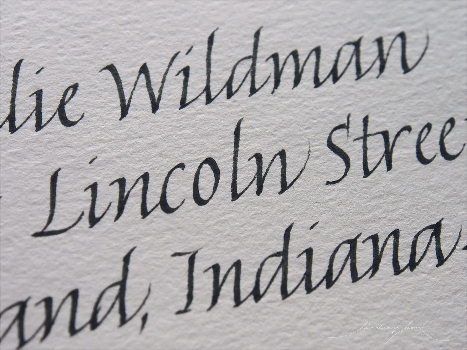 Simple swash accented the copperplate roundhand script on shimmery card stock with custom mix “mink champagne” ink.