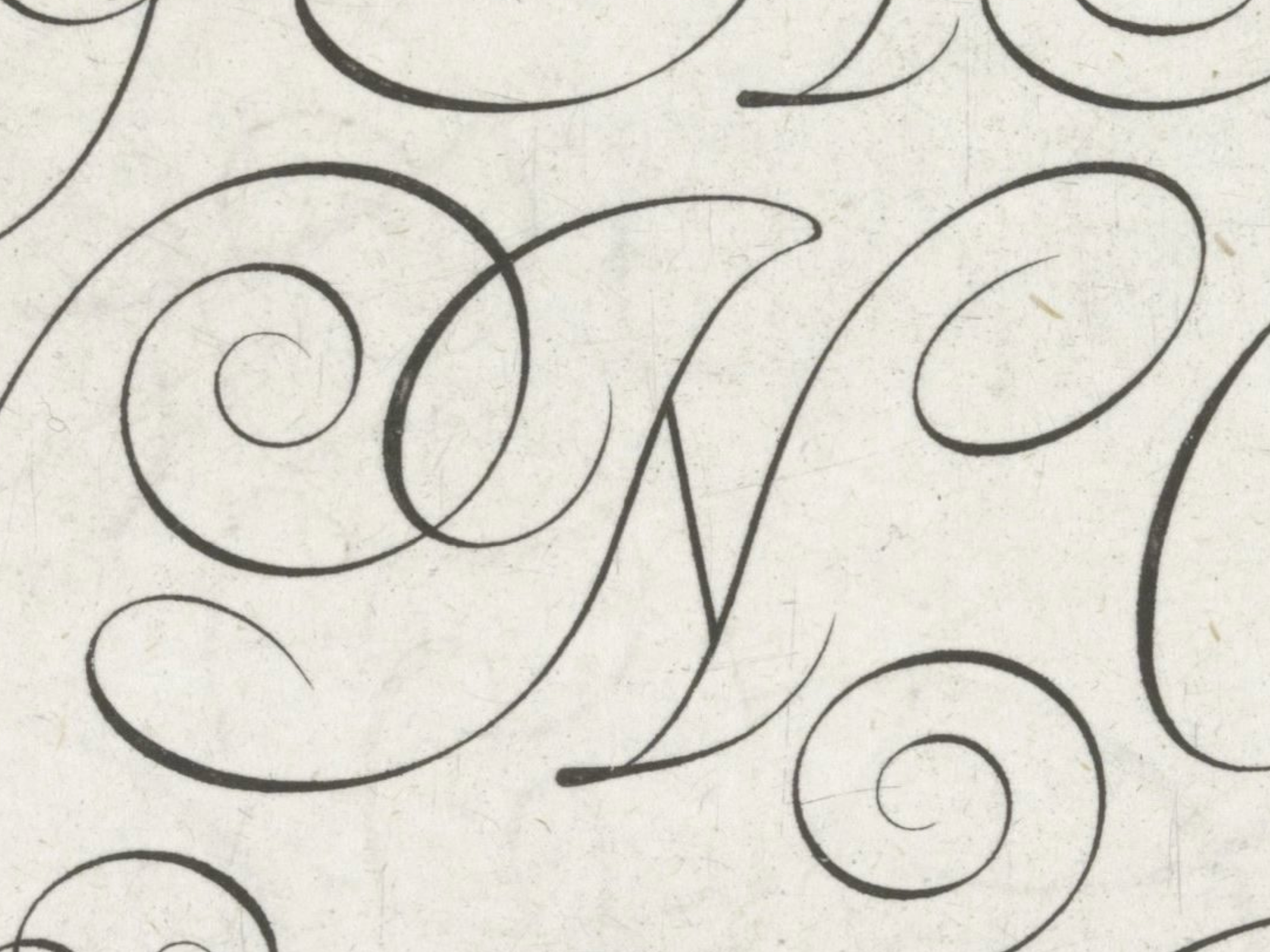 It’s interesting to note that the only place this happens is in the swashes that proceed out to the left from the top of the letterform, and the singular instance of the descender loop on the G. Coming from my perspective as someone familiar with English roundhand, and copperplate, and using an oblique pen holder, these swashes feel very natural. I also understand them from a design perspective. They balance the density of the letters. But I find myself wondering whether they were actually written like this in practice, or is this embellishment made easy due to the nature of engraving?